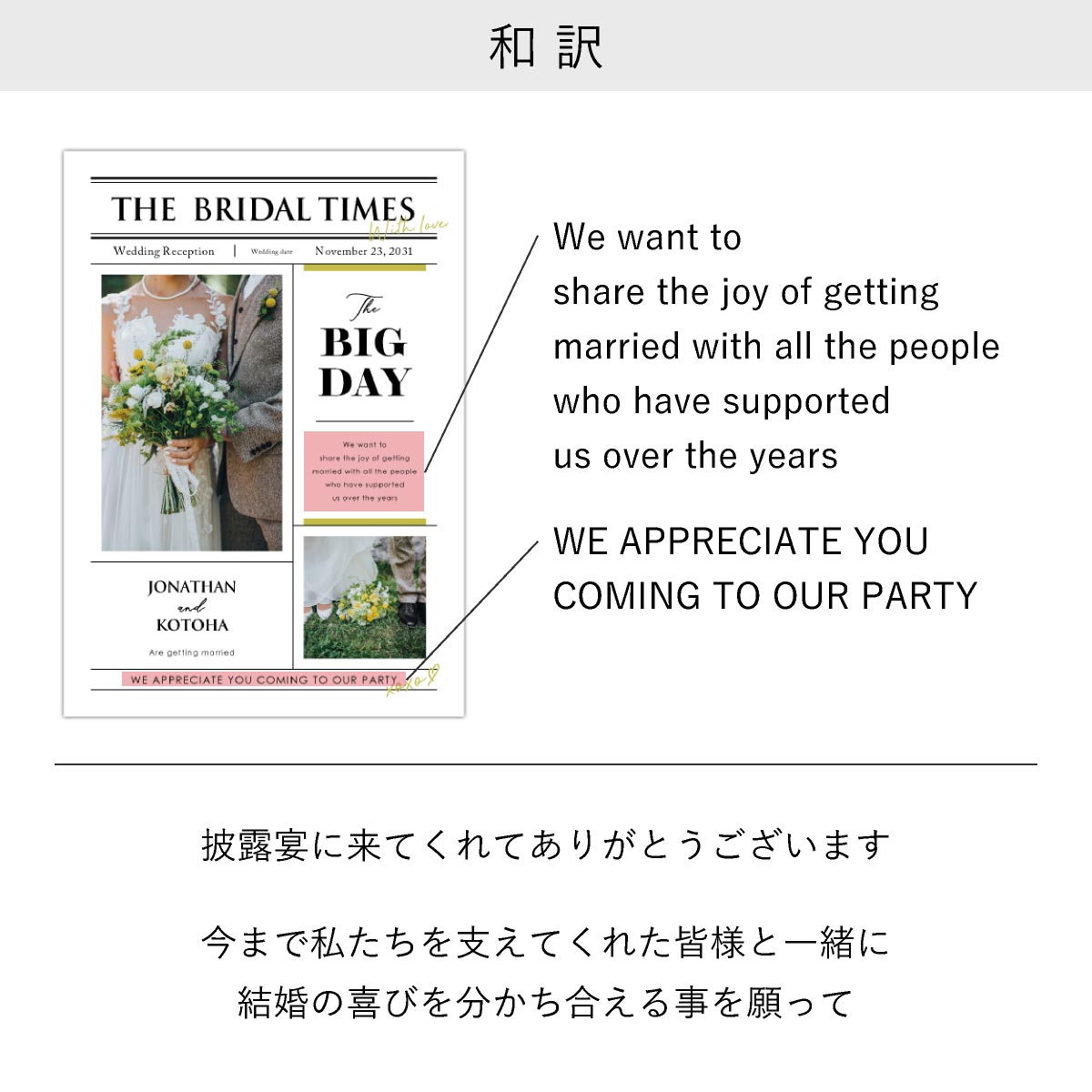 生年月日や出身地などの基本情報だけでなく、出会いや馴れ初め、思い出の写真や前撮り写真などを盛り込めば、ゲストさまにおふたりについて知ってもらうとてもよい機会になります。