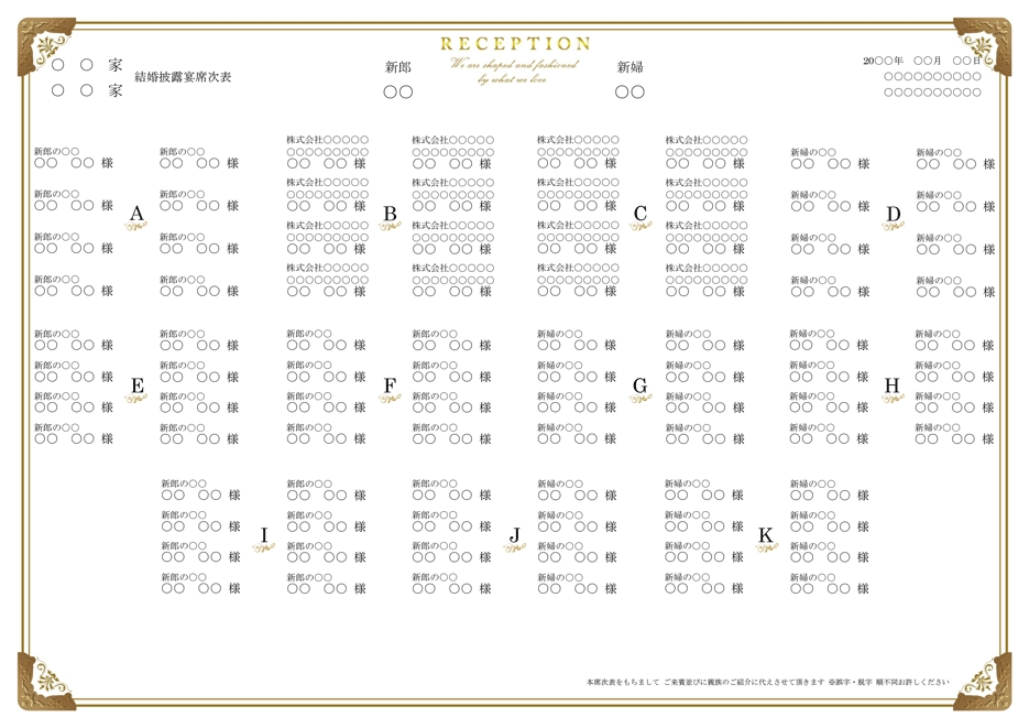 席次表にメニュー等も入りますが、受付で渡す席次表とは別に作成すると、ゲストのテーブル演出をランクアップできます。