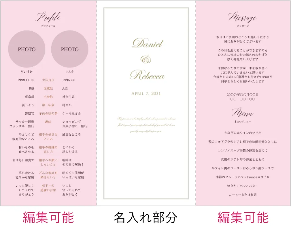 クリスマスをテーマに結婚式を行いましたが、ローズの切り抜いた柄や、ゴールドの上品な感じがちょうどよく、落ち着いた席次表が出来上がりました。 三つ折りの開くタイプかと思いきや、ゴールドのローズの切り絵のポケットに仕舞い込むタイプだったので想像とイメージは違いましたが新しいタイプの席次表だなと感じそんなに気になりませんでした。私の会場は縦長で三列型でテーブルを置く席次表を作成したのですがA4タイプでも見づらくなく、いいサイズ感でおまることができたんじゃないかと思います。 【席札】届いてから名札を席札にセットする時間2時間半くらい 【席次表】本紙を三つ折りにしてポケットに入れ込む作業2〜3時間 といったように、仕事が終わった平日の夜(2日3日)で、作業が簡潔したので負担も少なく終わってよかったと思います。 参考になれば幸いです。