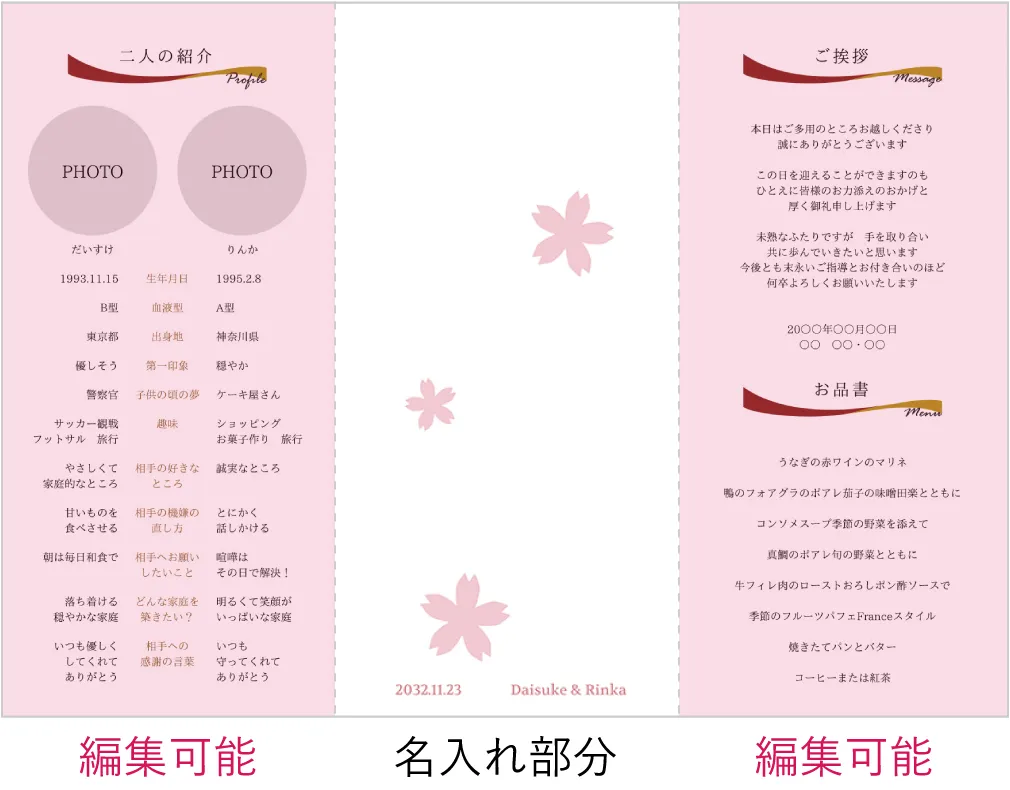 和装、桜の時期ということでこちらを選びました。 紙の質感もよく、デザインも可愛いねと言ってただけることが多かったです。 編集も何度も何度もやり直しできるので焦らず作成することができました。 注文から発注までもすぐに届いて、滞りなく準備することができました。