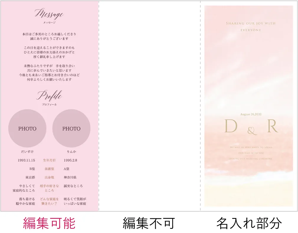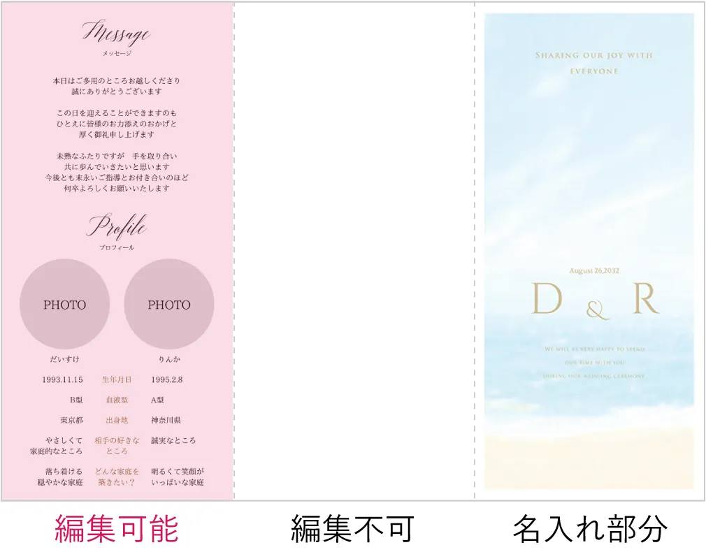 少人数でしたので3面もどうしようかと思いましたが、写真や文章を好きな様にアレンジして入れる事が出来ました。 タイトル画像を入れるのに苦労しましたが携帯でしたので透過アプリ等も活用しながら作成できました。 細々保存できるので仕事の休憩や合間で少しづつ作る事ができ良かったです。 紙も頑丈で印刷も問題ないです。