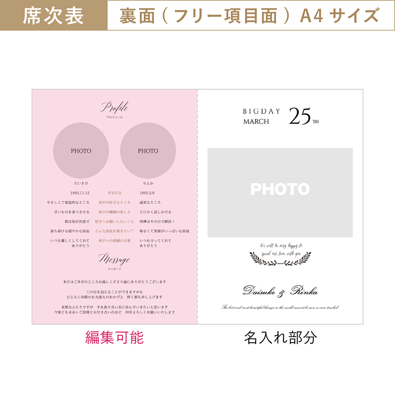私はシーティングチャートを掲示したため、個人用の席次表は不要だったため、この席次表をプロフィールブックとして使用しました。見開き2ページ分と少ない量ですが、ゲストからの反応も良かったです。作成時は席次表用のテンプレートしかないため多少苦労はしましたが、ネットから素材画像などを添付してかわいく装飾できましたし、ガイド線もあるため自由作成時もきれいに整える事ができました。 トレーシングペーパーをかぶせるだけで一気にオシャレになると思います!