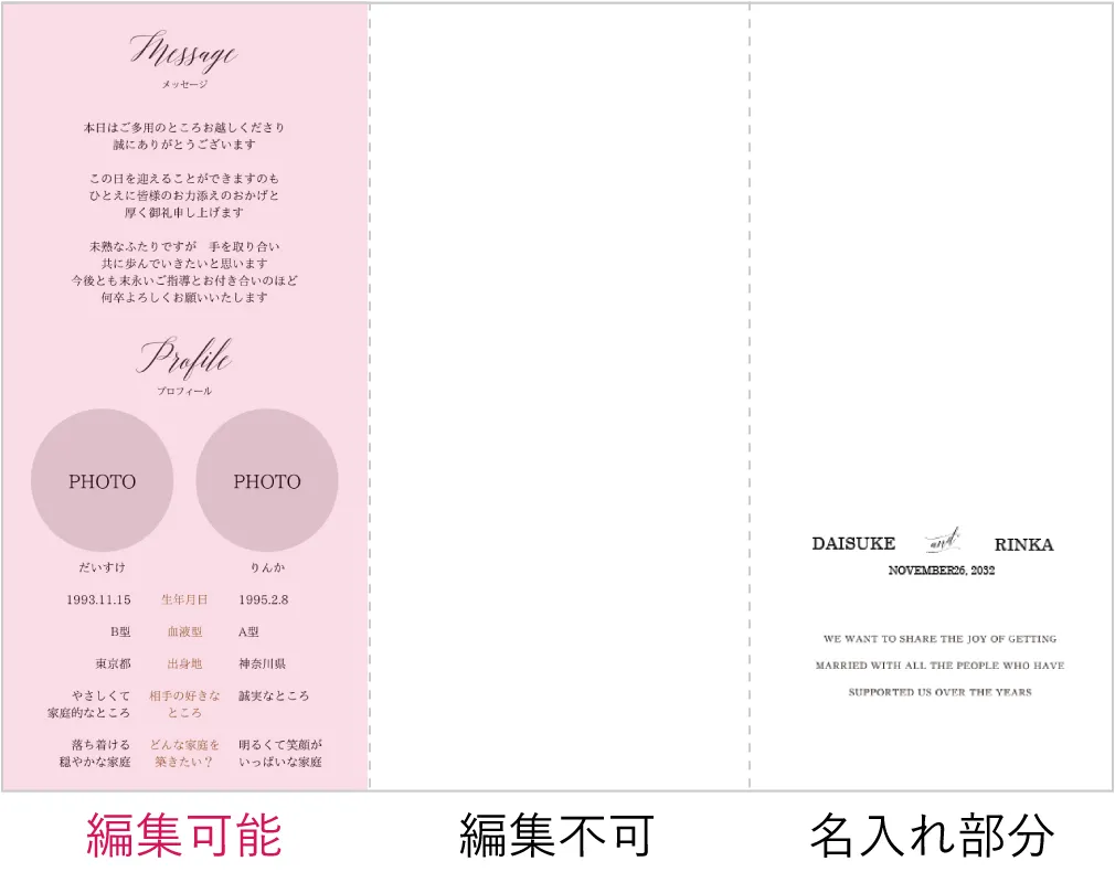 表紙が厚めのトレーシングペーパーでとてもおしゃれです。 名前と日にちを表紙(表紙に透けるように)入れられるところと、プロフィール面の構成が自由に簡単に変えられたところが気に入っています。 組み立ては折り目がついているため簡単ですし、大満足です。 結婚式当日にゲストの方々が手に取ってくださる日が楽しみです。