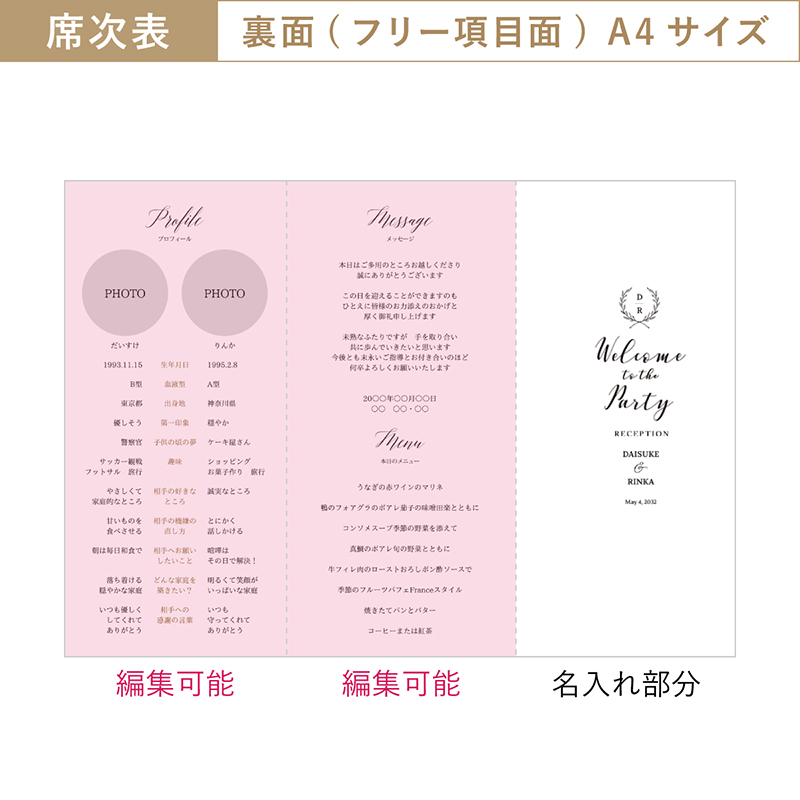 席次表にメニュー等も入りますが、受付で渡す席次表とは別に作成すると、ゲストのテーブル演出をランクアップできます。