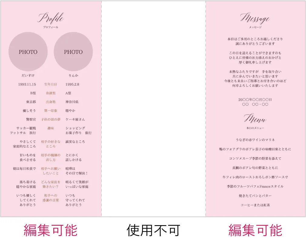 お安いのでペラペラかと思いましたが、高級感もあり、とっても素敵な席次表になりました。 プロフィールを入れたくなかったので色々いじれたのもメリットが大きかったです。 組み立てもさほど苦ではありませんでした。