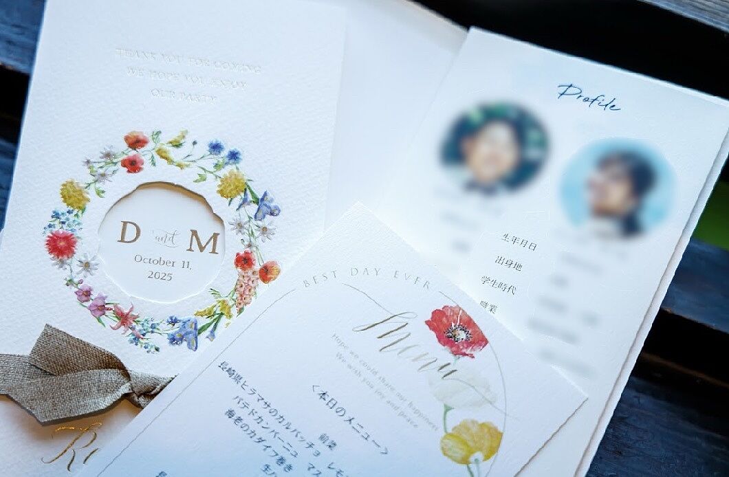 親族のみの挙式のあとの食事会で利用しました。どれも紙の質がしっかりしていて、お花のぷっくりとした加工も発色も可愛くてオーダーして本当によかったです。印刷のかすれなどもありませんでした!麻ひもの結び方は少しコツがいりますが、動画も公開されていてわかりやすいです。手元に届いてから結ぶことで、手作りしたような愛着もわいて満足のいく出来になりました。 印字される文字が小さめに設定されていたことと、配置で一括中央揃えにする機能がなかったので、一つ一つ編集するのが大変でした。