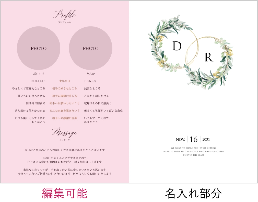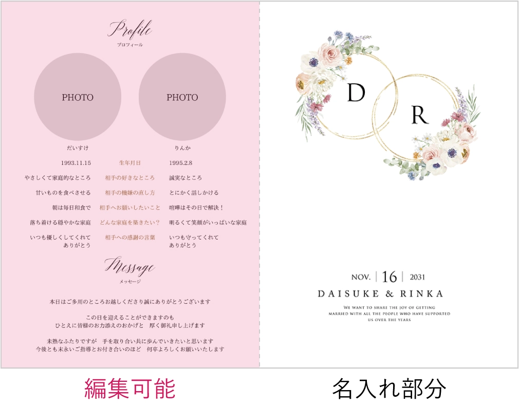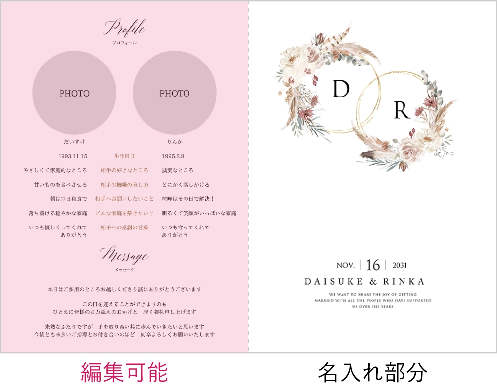式場よりもお安く、席札とメニュー表も無料特典で付いていました! サンプルを請求し、実際の質感を確認できたので安心して注文することが出来ました。 作成も簡単で分かりやすいのでおすすめです!
