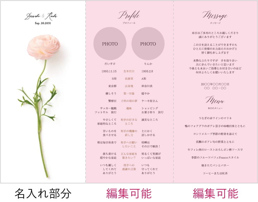 とても素敵な商品を安く購入できてよかったです! ただ、データ入力する専用サイトが何度も落ちてしまい、何時間かプラスでかかったと思っており、使い勝手が悪かったので改善いただけると未来の花嫁さんが助かると思います。