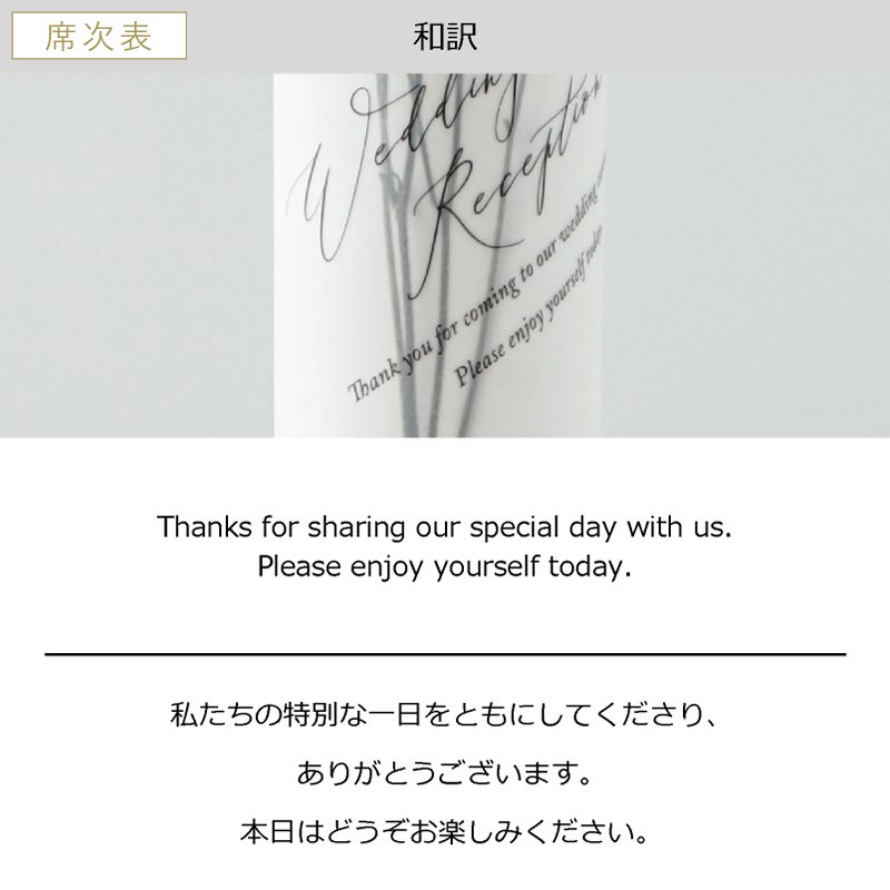 席次表にメニュー等も入りますが、受付で渡す席次表とは別に作成すると、ゲストのテーブル演出をランクアップできます。