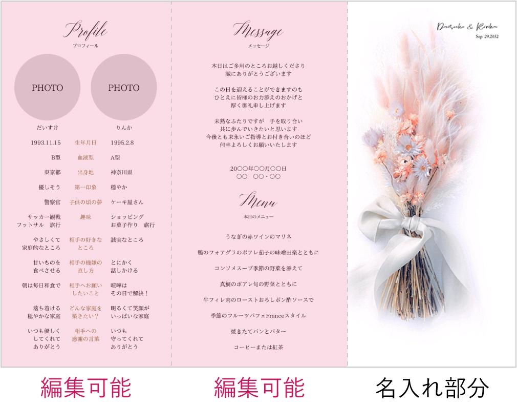席次表にメニュー等も入りますが、受付で渡す席次表とは別に作成すると、ゲストのテーブル演出をランクアップできます。