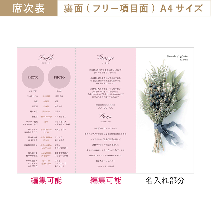 アプリに従って作れば、簡単に席次表も作成できます。折り目もついてるので、とても作りやすかったです。 表紙のドライフラワーが、とても可愛いです!