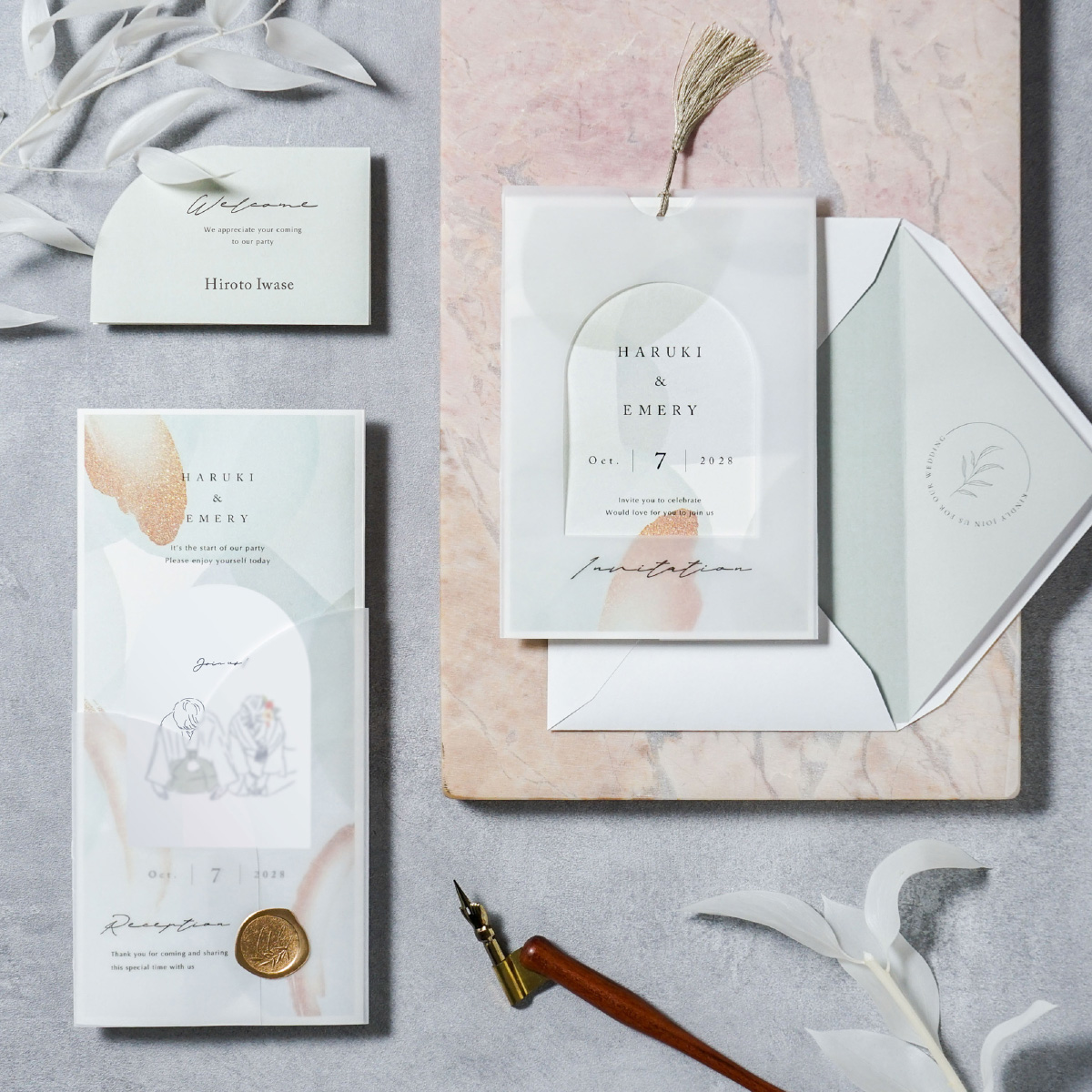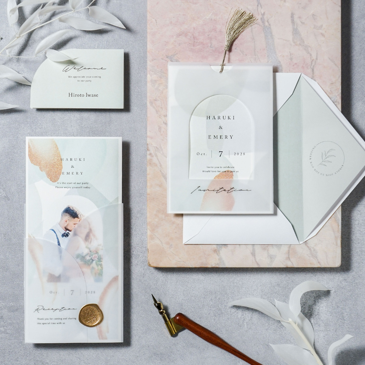 この種類の席次表を4色とも頼みました。単体でももちろん可愛いのですが、トレーシングペーパーとゴールドのシーリングシールを付けると高級感があって一層可愛くなります! グリーンはナチュラルな感じですがニュアンスカラーなので偏りすぎずにちょうどいい色合いです。 中の台紙も選べるのでこだわりたい方にもおすすめです!
