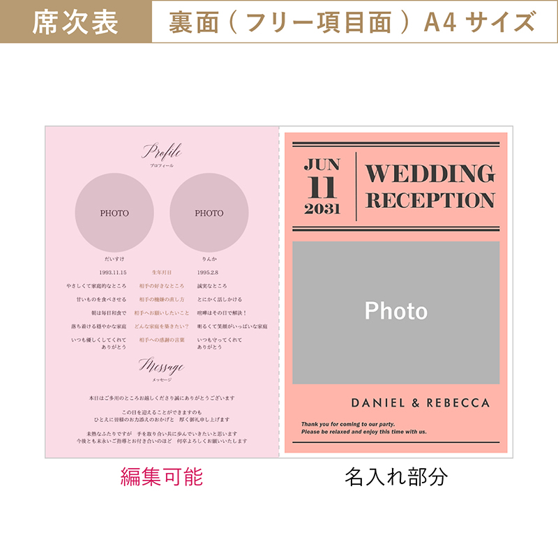 【48%OFF】ラ・マガジン ホリデイピンク【印刷込】A4席次表+席札(無料)セット|結婚式 席次表ならPIARY(ピアリー)