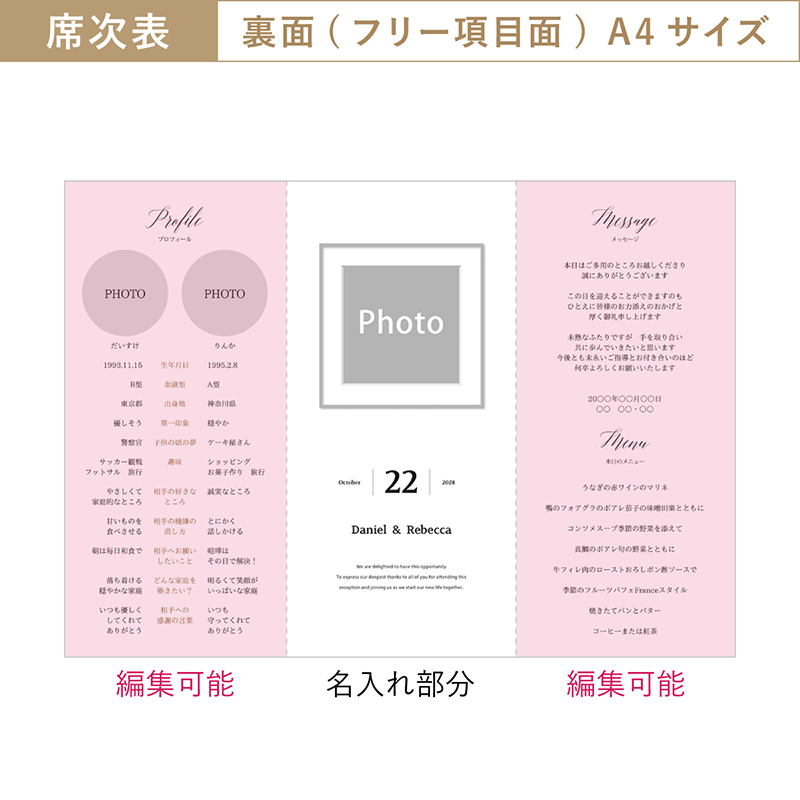 席次表にメニュー等も入りますが、受付で渡す席次表とは別に作成すると、ゲストのテーブル演出をランクアップできます。