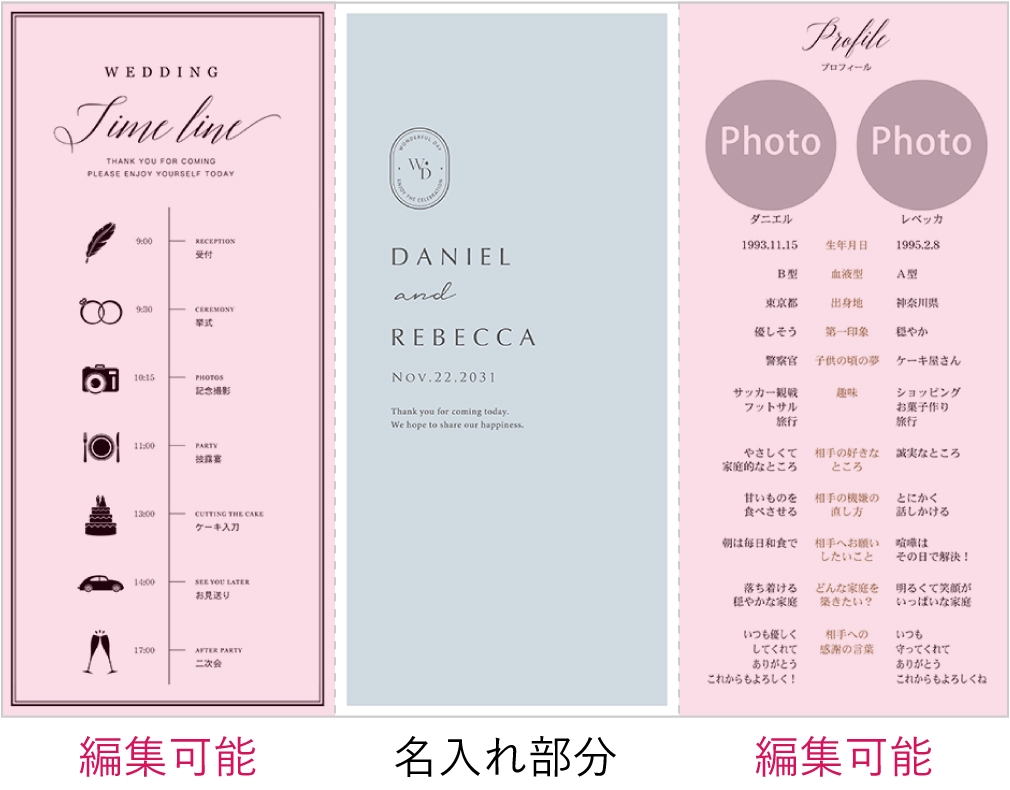 席次表にメニュー等も入りますが、受付で渡す席次表とは別に作成すると、ゲストのテーブル演出をランクアップできます。