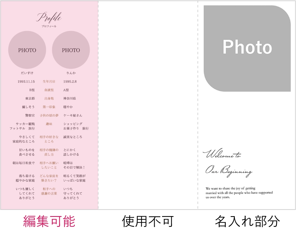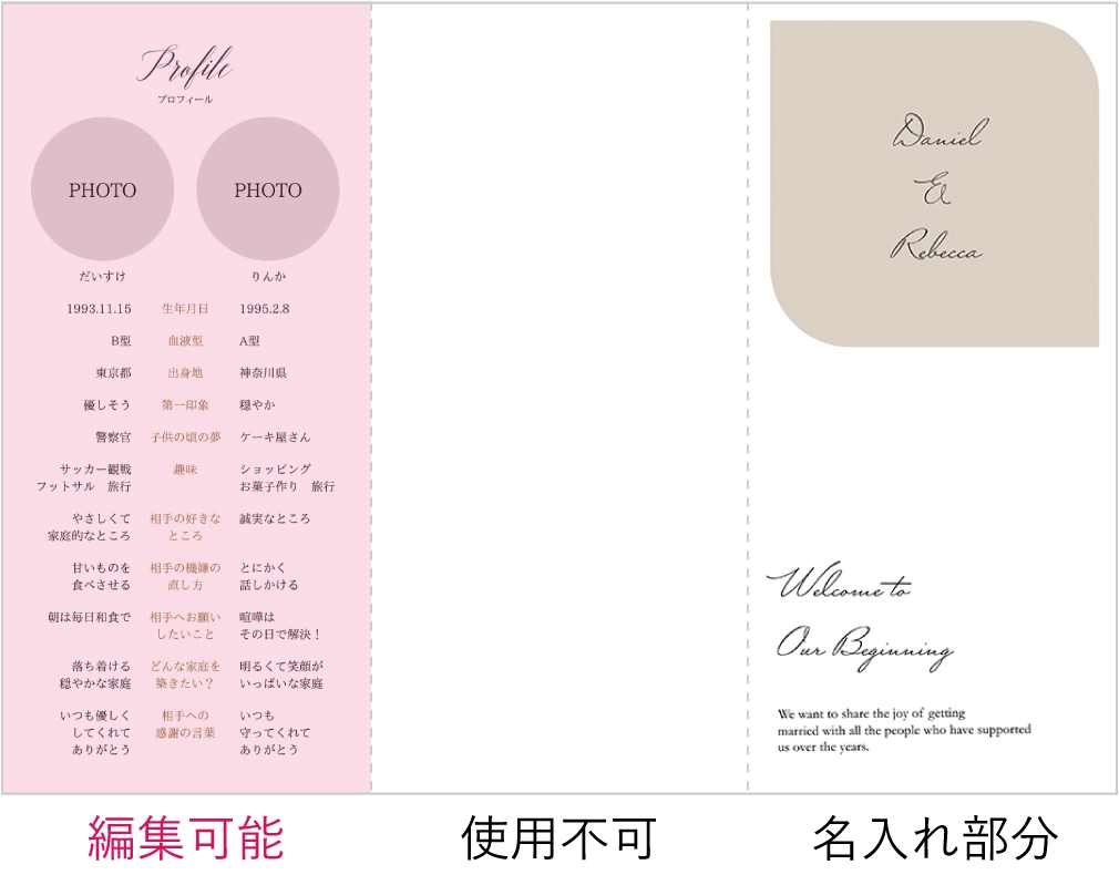 表紙や席次表のデザインが5つあり、全員同じでないところに惹かれました。 式場のガーデンに合うナチュラルなデザインばかりでとても気に入っています。 ただ帯のトレーシングペーパーを付ける時に破れやすいところが準備の上で大変でした。
