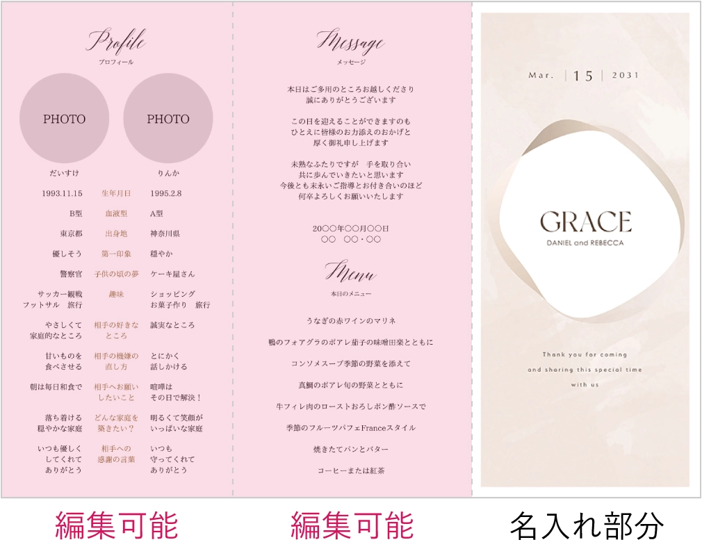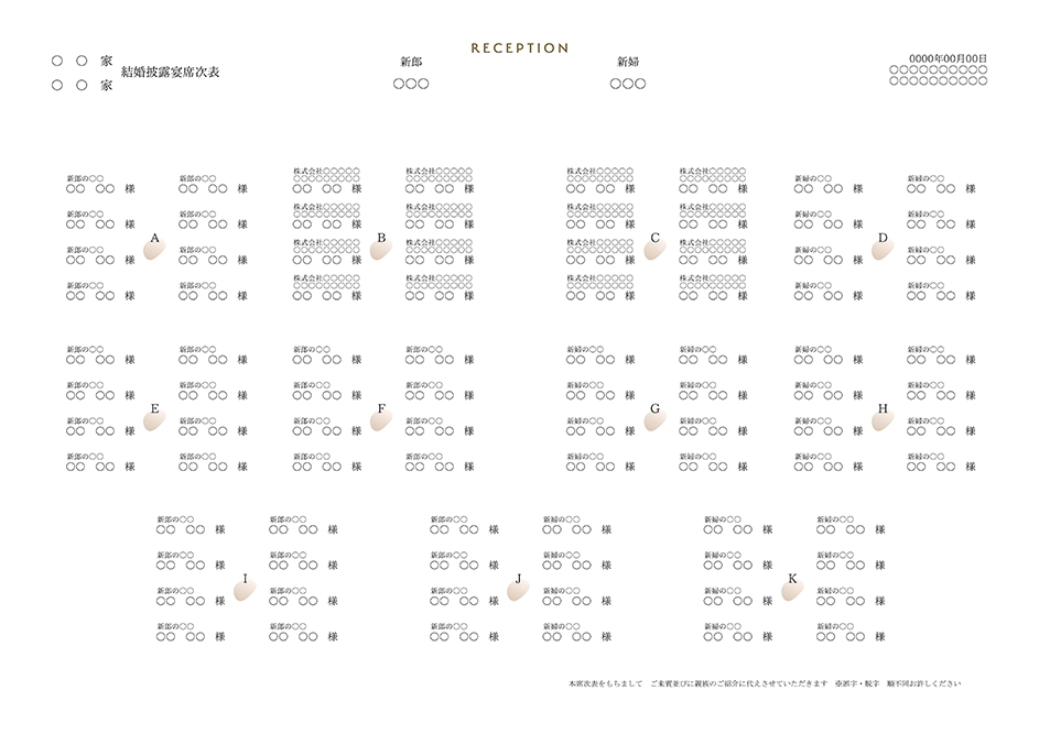 席次表にメニュー等も入りますが、受付で渡す席次表とは別に作成すると、ゲストのテーブル演出をランクアップできます。