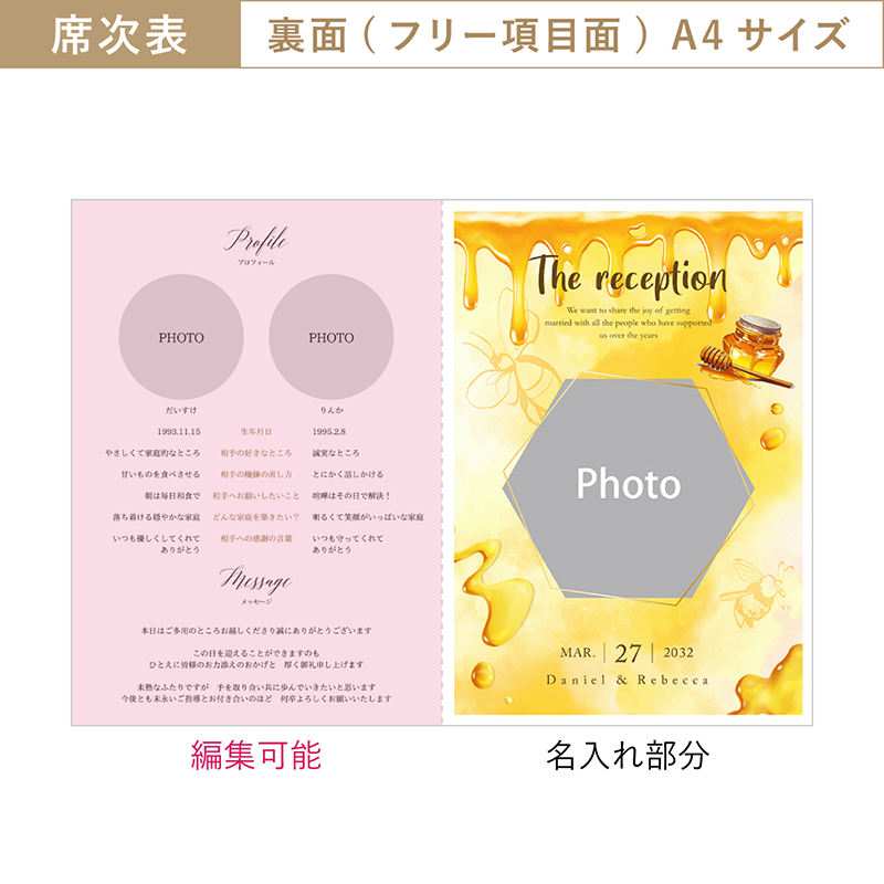【48%OFF】Melting honey -メルティングハニー- 【印刷込】A4席次表+席札(無料)セット|結婚式 席次表ならPIARY(ピアリー)