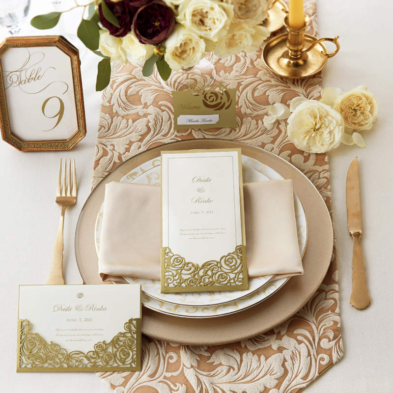 席次表にメニュー等も入りますが、受付で渡す席次表とは別に作成すると、ゲストのテーブル演出をランクアップできます。
