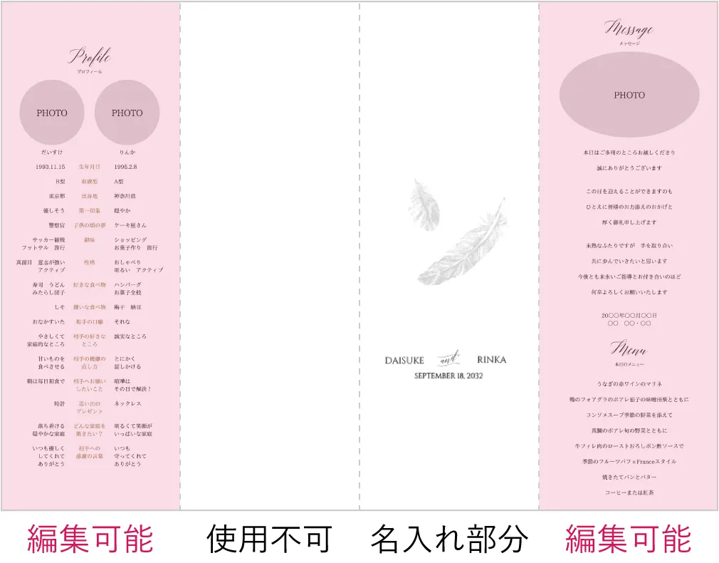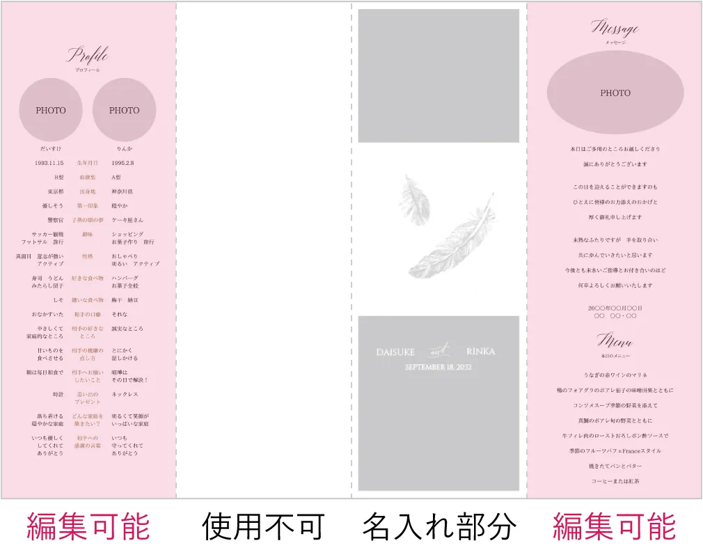 天使の羽のようなデザインが式場の雰囲気に合っており、気に入りました。また、A3だと編集可能な面が増えているのもよかったです。どのデザインもそうですが、組み立てイメージと編集する面の対応は必ず確認してくださいね。思いがけず逆になっていることもありますので。