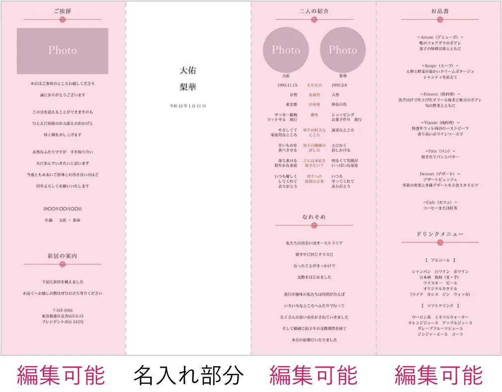 席次表にメニュー等も入りますが、受付で渡す席次表とは別に作成すると、ゲストのテーブル演出をランクアップできます。