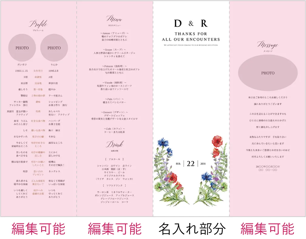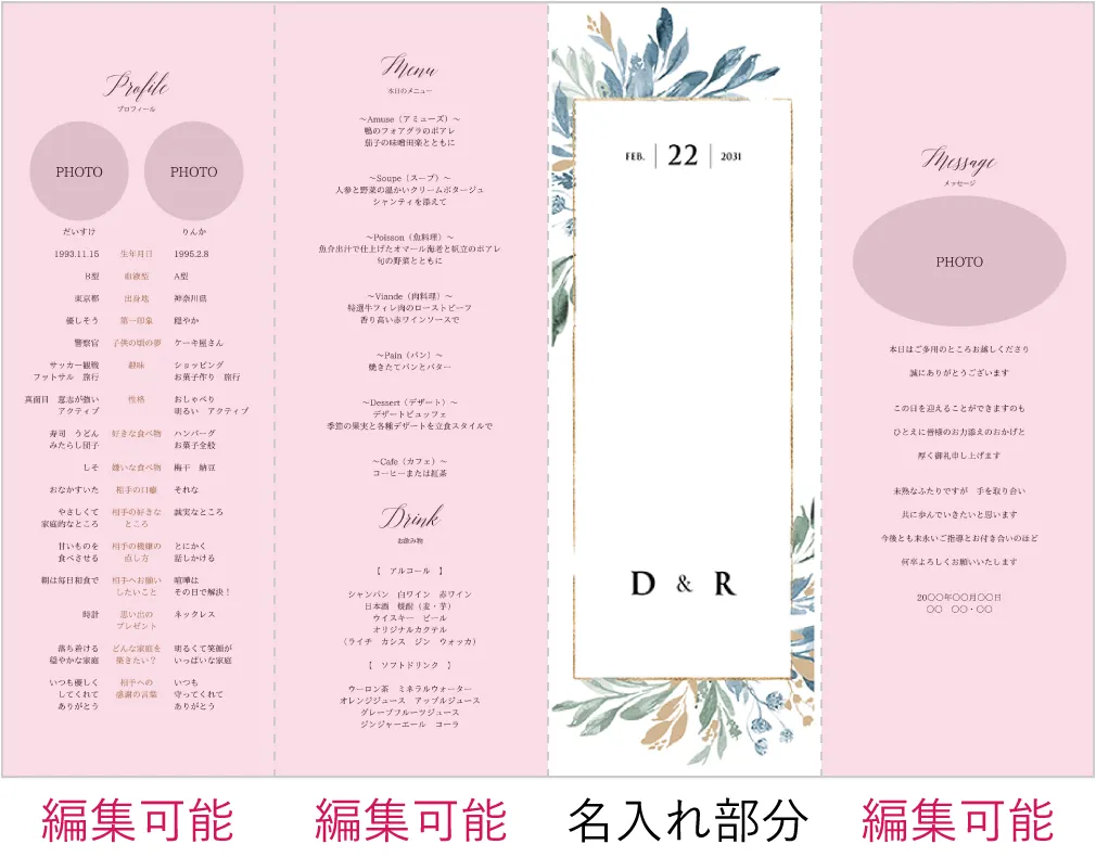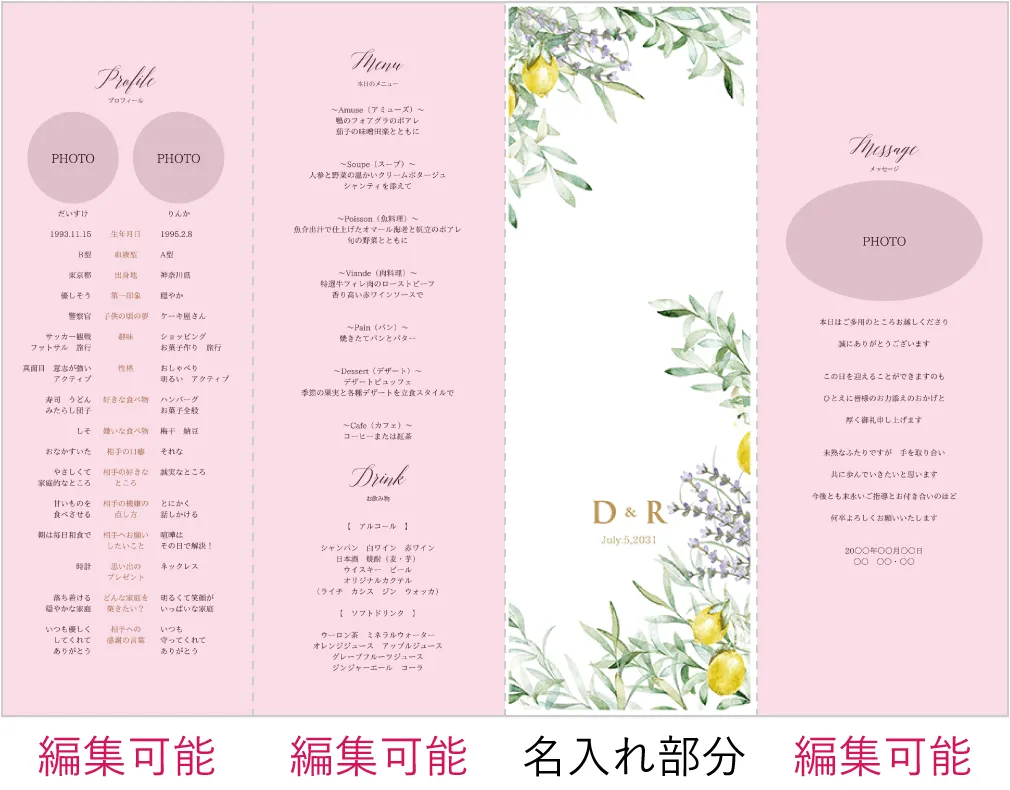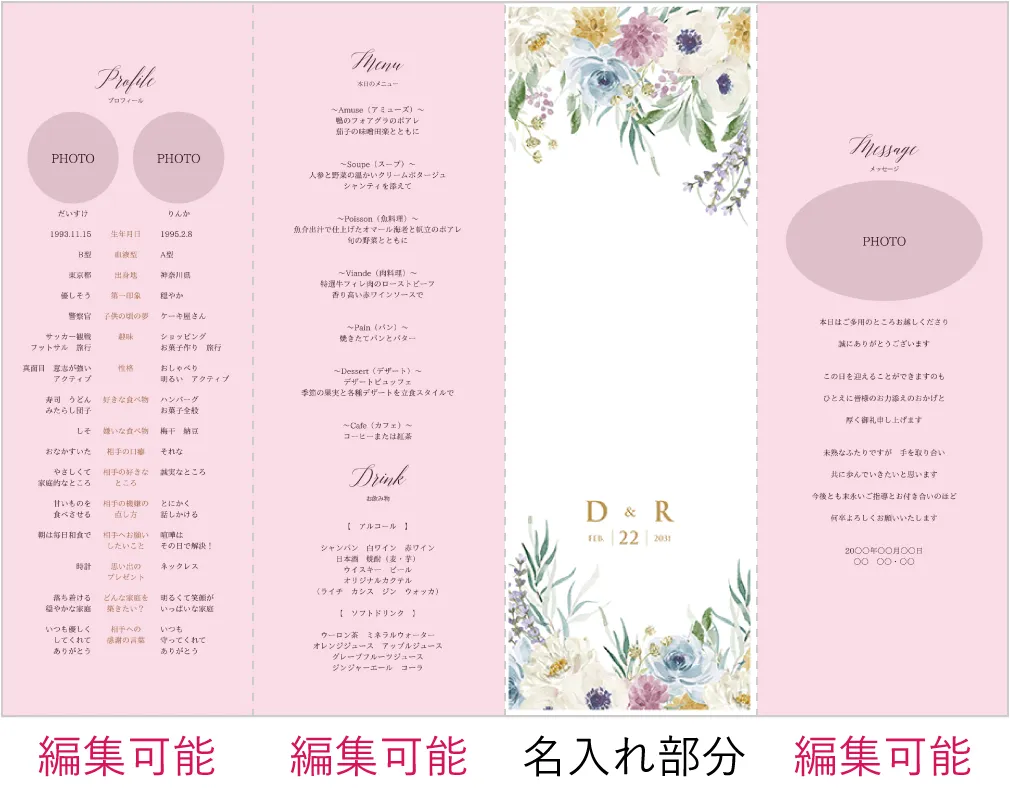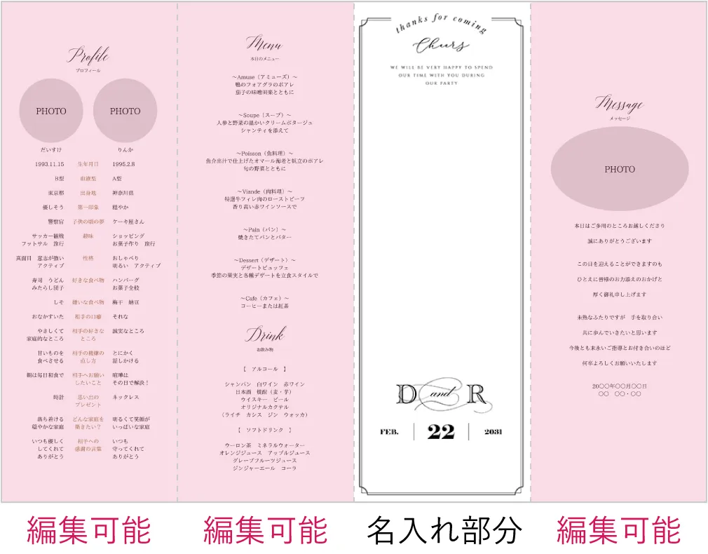 席次表にメニュー等も入りますが、受付で渡す席次表とは別に作成すると、ゲストのテーブル演出をランクアップできます。