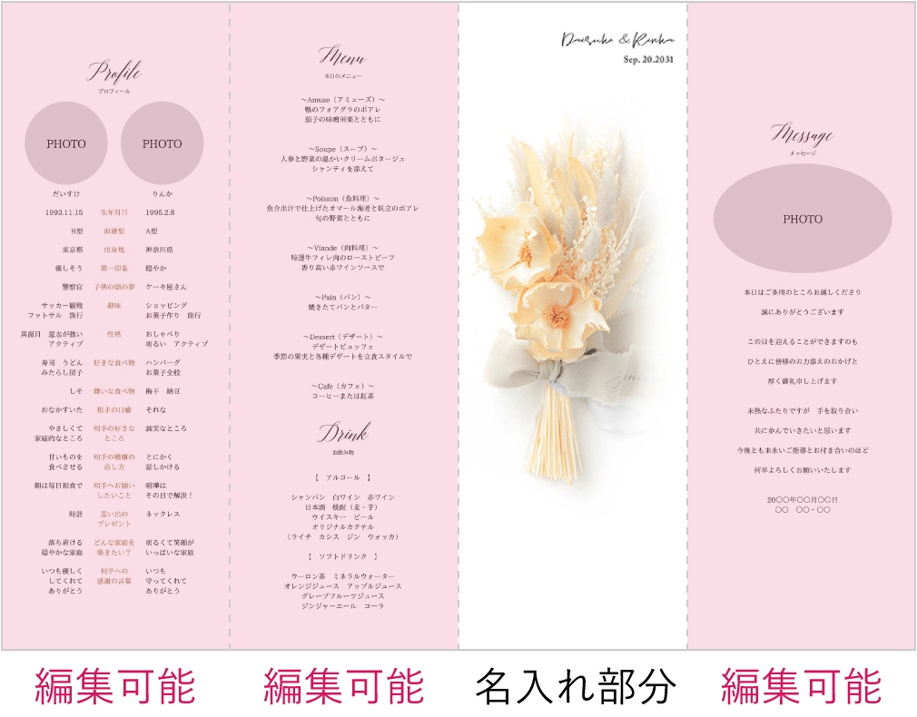 席次表にメニュー等も入りますが、受付で渡す席次表とは別に作成すると、ゲストのテーブル演出をランクアップできます。
