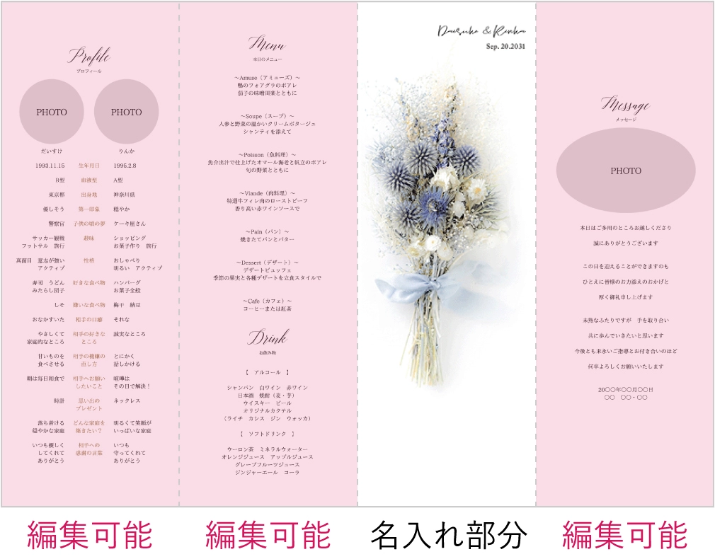 席次表にメニュー等も入りますが、受付で渡す席次表とは別に作成すると、ゲストのテーブル演出をランクアップできます。