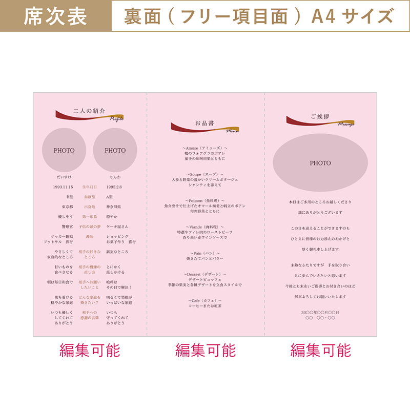 | 席次表 中紙 210×297mm(A4ナチュラル・三つ折筋入り) | 10枚 |