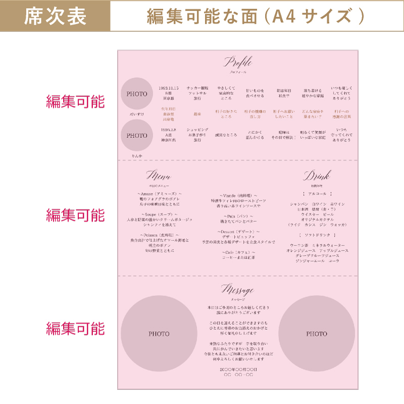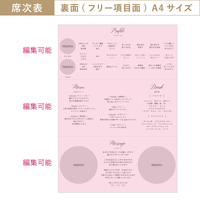 とてもお安いのに豪華で、満足しています。 席次の入力方法も簡単で、プロフィール面を自分でカスタマイズできるのもよかったです!