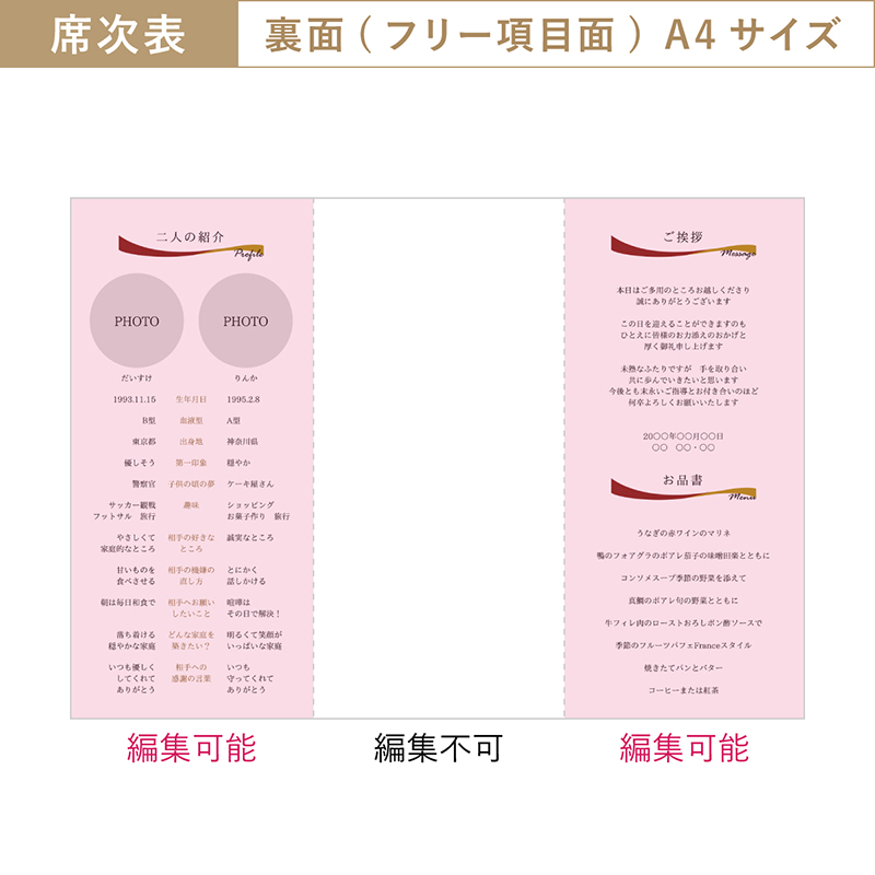 おふたりのプロフィールに加え、メニューやタイムラインなどが印刷できます。