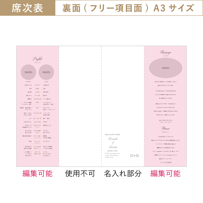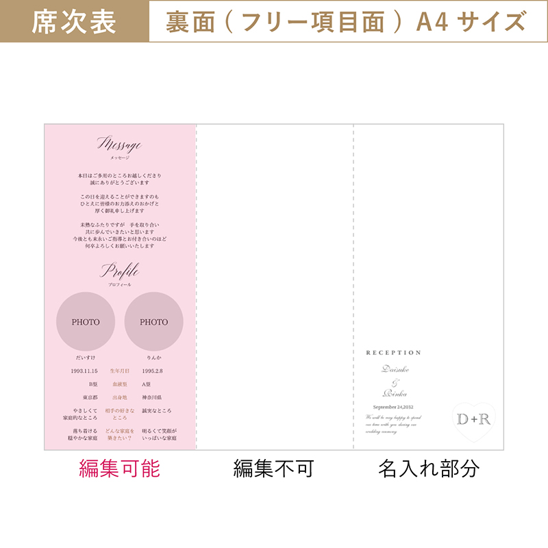 席次表の用紙が高級で想像以上の満足でした。 外フレームは、慎重に折り込まないとデザイン的に崩れやすいです