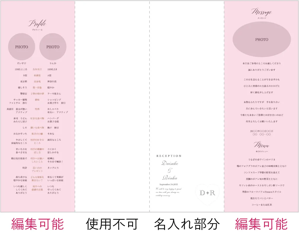 ペーパーアイテムをこのシリーズで揃えました。 このタイプだと裏面が台紙で覆われているので、見開き3面の席次表と、1面分にプロフィールとメニューを記載しました。 載せたい情報がたくさんある方だと少し範囲が足りないと感じてしまうかもしれません。 切り絵の部分は繊細で私たちの式のイメージともぴったりで素敵でした。 表紙のハート部分はそのまま使いました。