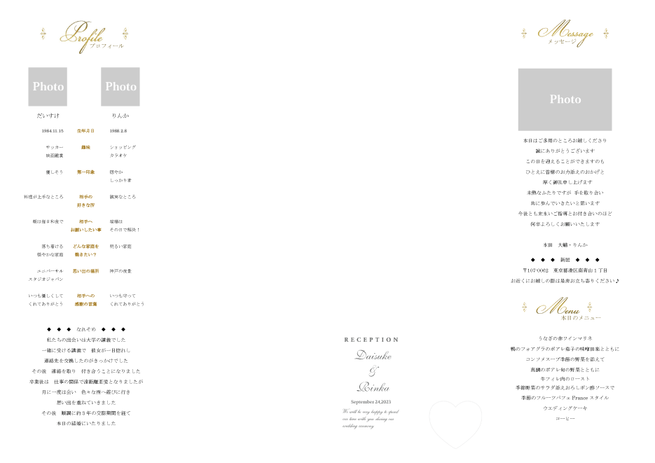 おふたりのプロフィールに加え、メニューやタイムラインなどが印刷できます。