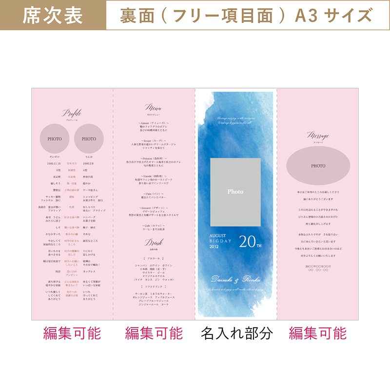おふたりのプロフィールに加え、メニューやタイムラインなどが印刷できます。