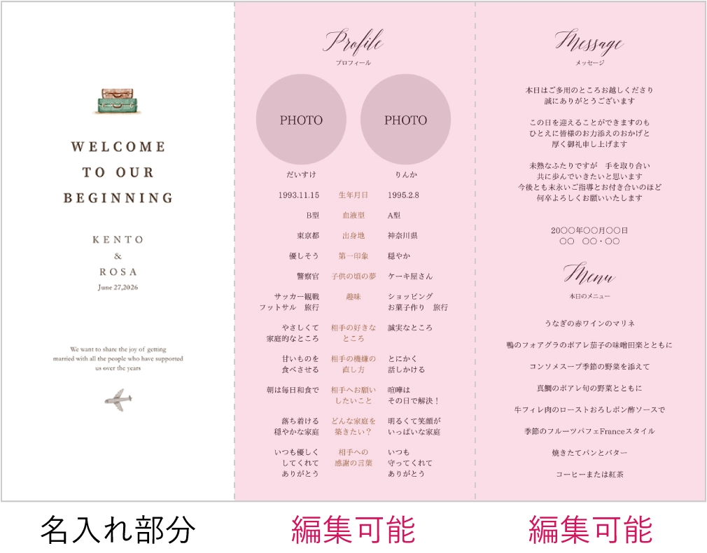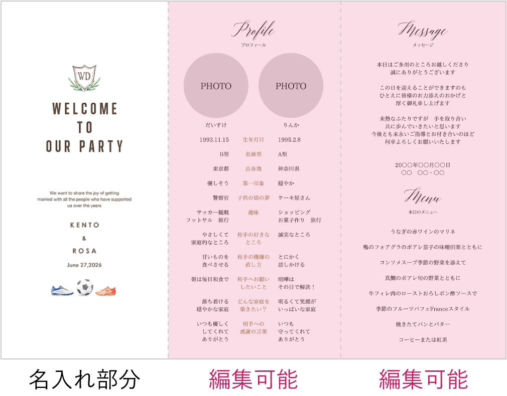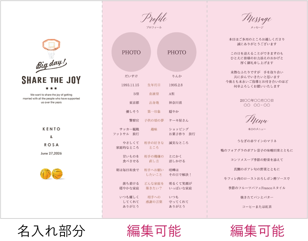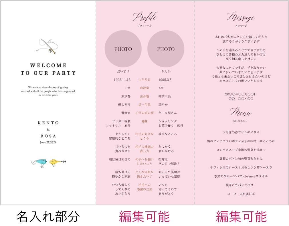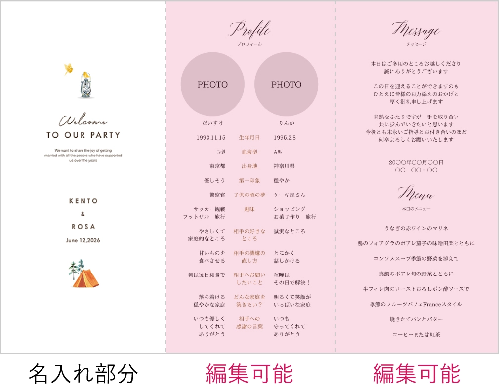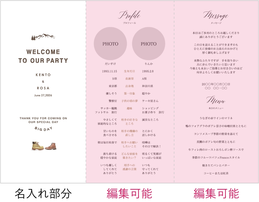 2人とも登山が趣味なのでイラストがめちゃめちゃ合っていた。 くるくる丸めたり紐つけたりタグつけたり少しめんどくさかったけど、席次表がカゴに入って受付に置いてあるのはめちゃめちゃよかったと思う。単純作業なら新郎も手伝ってくれる。 ただカバンには入れずらいみたいで紐解いてからは三つ折りにしているゲストも多かった。