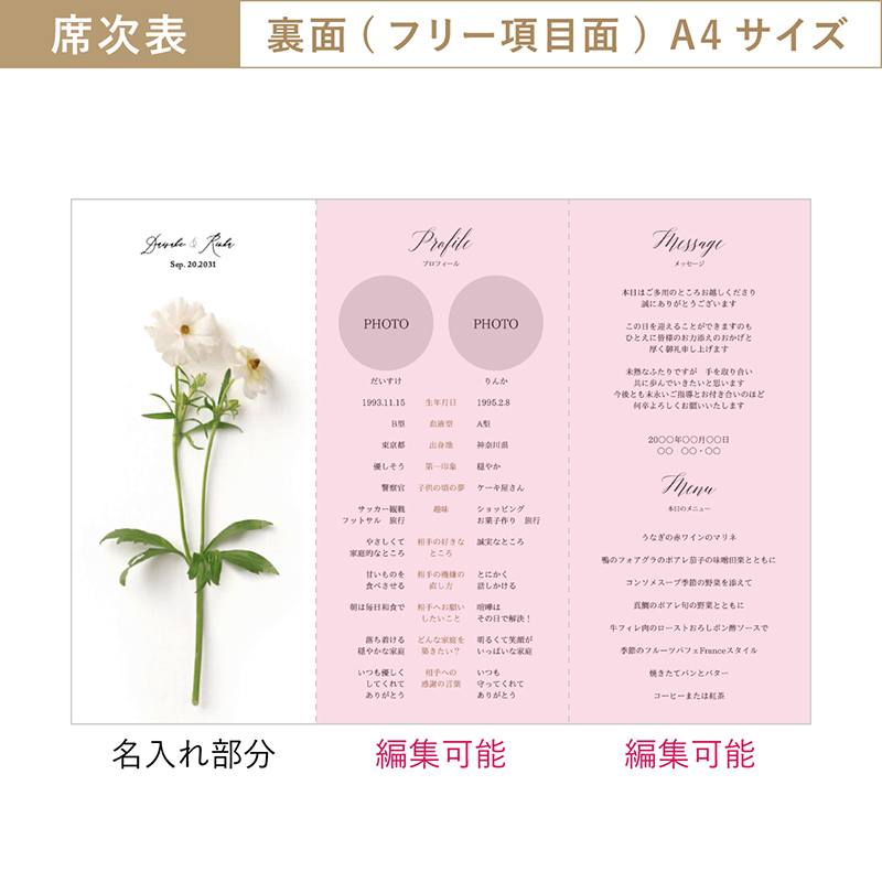 おふたりのプロフィールに加え、メニューやタイムラインなどが印刷できます。