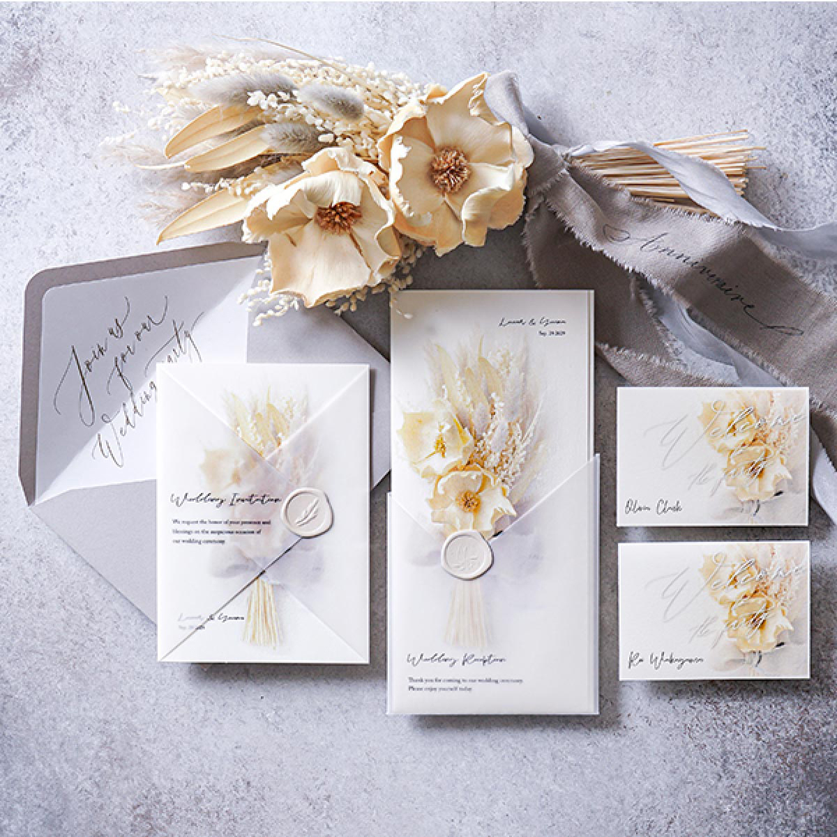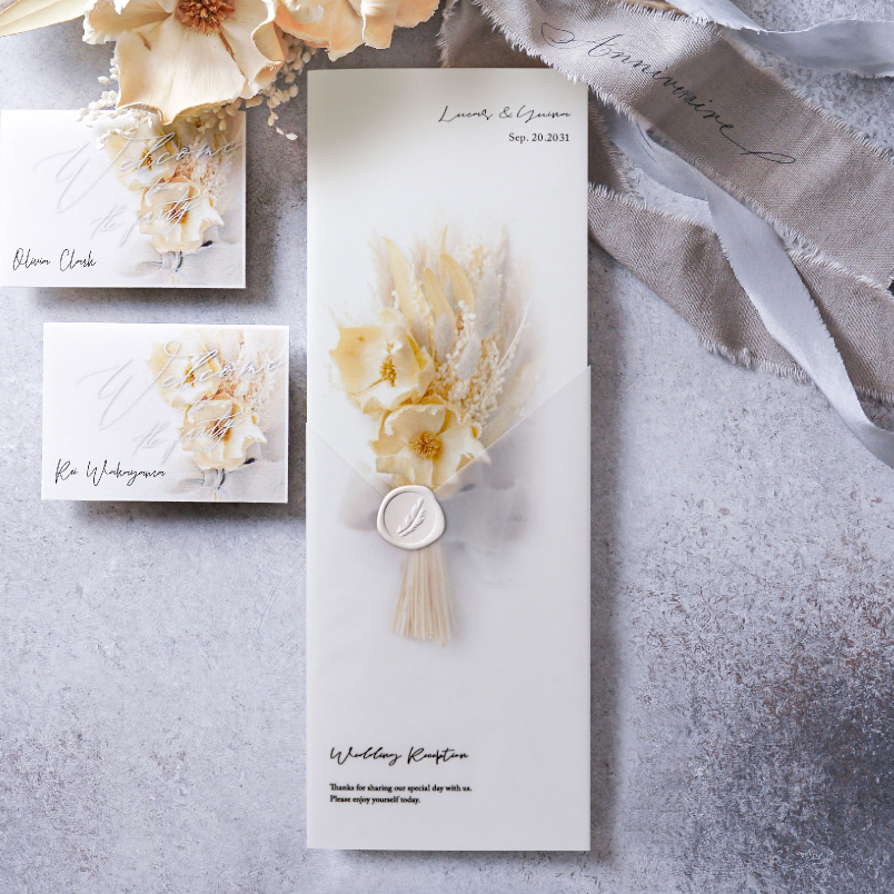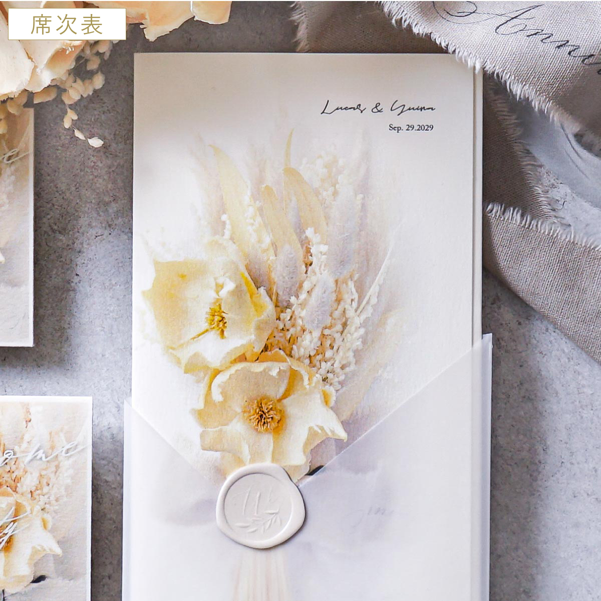 三つ折りされただけの席次表を良く見る形だったのですが、流行りのシーリングスタンプ風シールとトレーシングペーパーが使われていて良かった。流行を抑えるだけでなく、可愛らしさと上品さの両方を兼ね備えており、かつ綺麗な仕上がりで嬉しかった。同じシリーズの招待状を利用したが、ゲストからも素敵な招待状と喜んでもらえて嬉しかった!