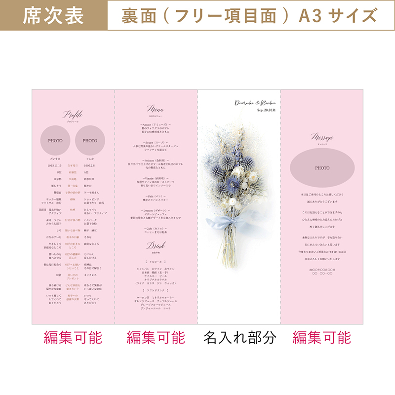 | 席次表 表紙 A4:縦130×横240mm A3:縦184×横243mm | 10枚 |