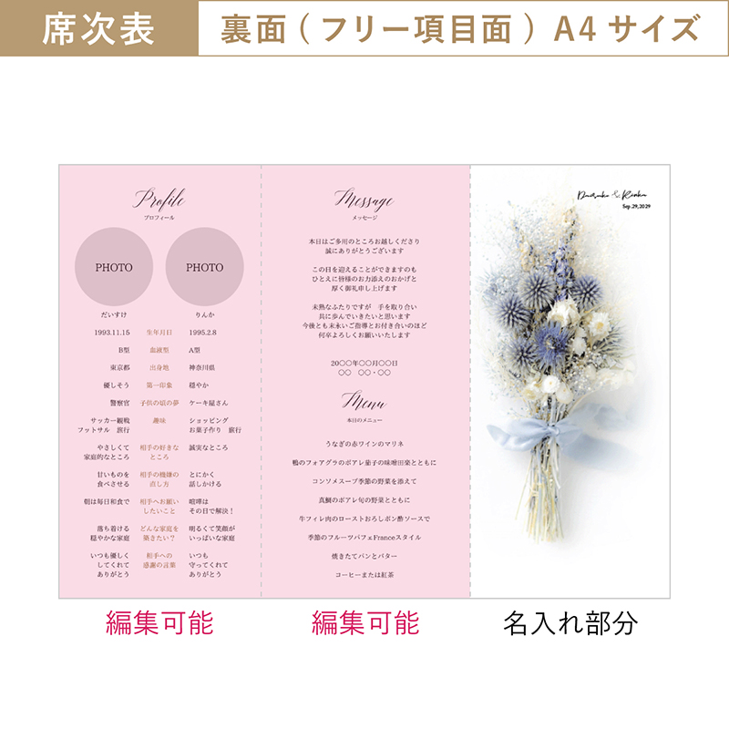 おふたりのプロフィールに加え、メニューやタイムラインなどが印刷できます。