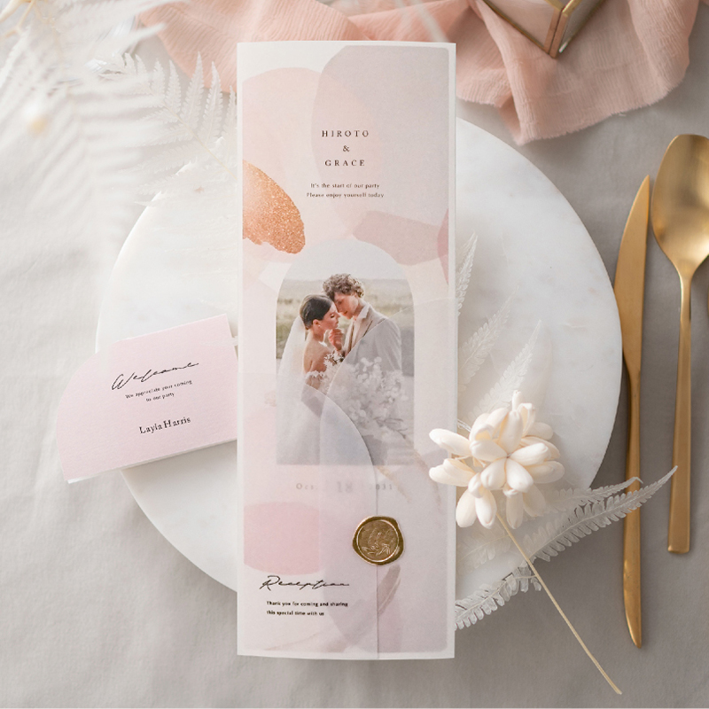 紙質がとてもよかったです。届く前から上手に折れるか心配でしたが、届いて見てみたら折れ線がついていたので、綺麗に折ることができました!真ん中はイラストにしましたが、主張し過ぎない淡い感じのイラストで、デザインと馴染んでとてもかわいかったです!