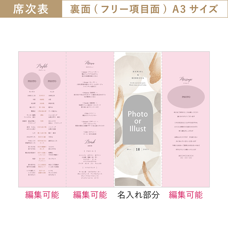 おしゃれなデザインで、特に秋婚の方におすすめです。事前にサンプルも送ってくださったので、イメージが湧きました。90名でA4を注文したのですが、席次表の文字がかなり小さくなってしまったので、大人数の方はA3を頼んだほうがいいと思います。
