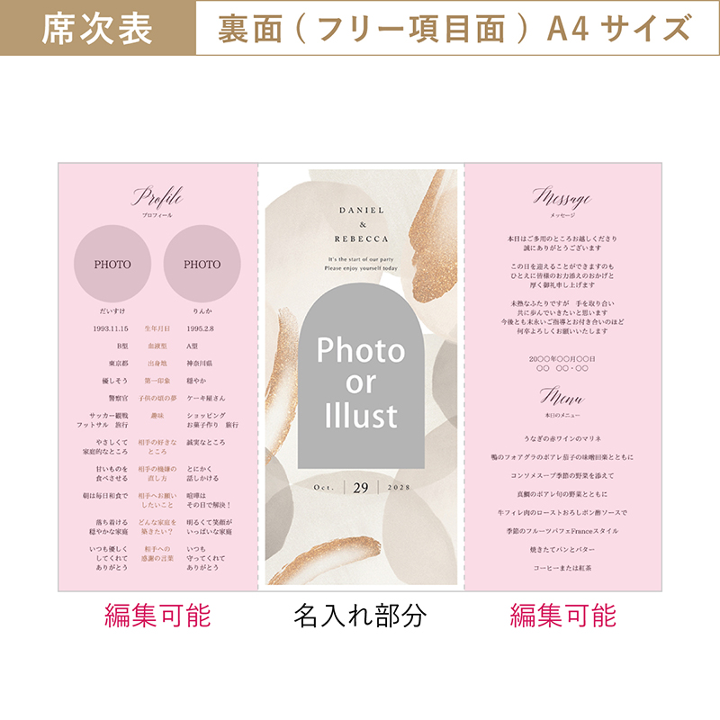 おふたりのプロフィールに加え、メニューやタイムラインなどが印刷できます。
