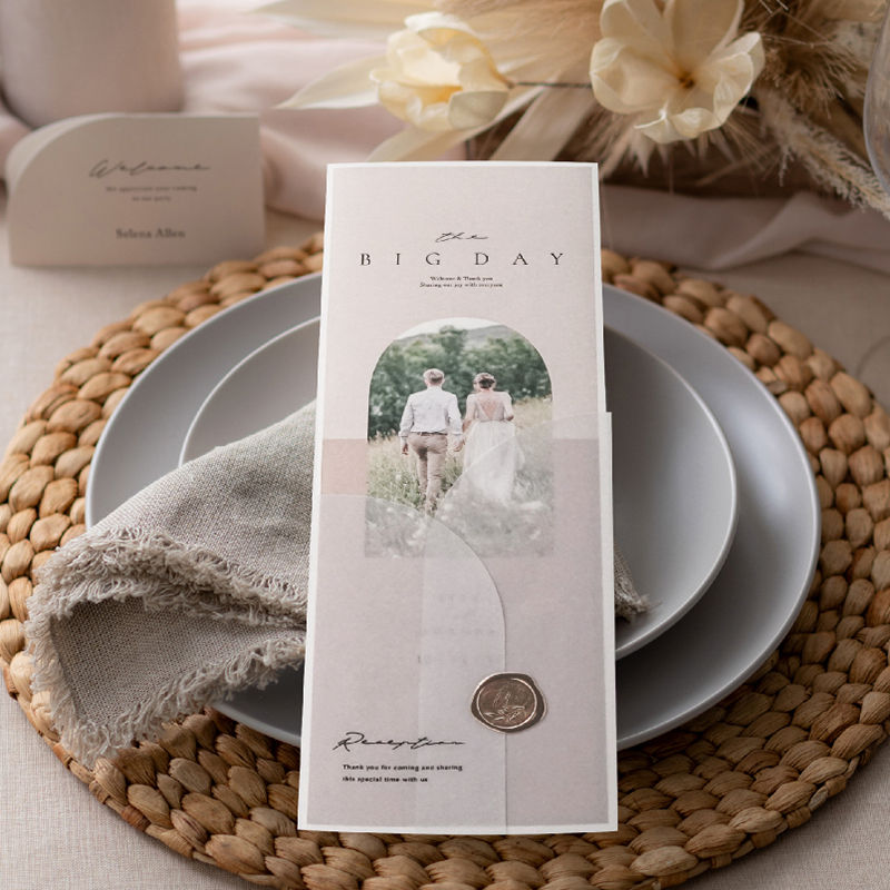 同じデザインのもので席札・招待状などもまとめて注文しました。 先に欲しい招待状と分けて発送ができる点、中身を座席表・プロフィール・メニュー表と好きなようにカスタムできた点、1つにまとめることが出来たのがとても有難かったです! ただ、外注なので届いてからの作成の際、トレーシングペーパーが柔らかく綺麗に折りづらかったりしたので、星4にしております。 また、サイトを見れば組み立て方は分かったのですが、一緒に組み立て方を同封して頂けると嬉しかったかなと思います。 満足です!