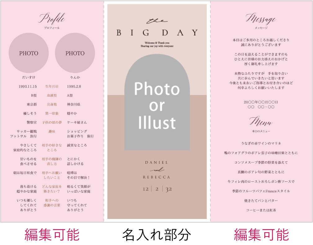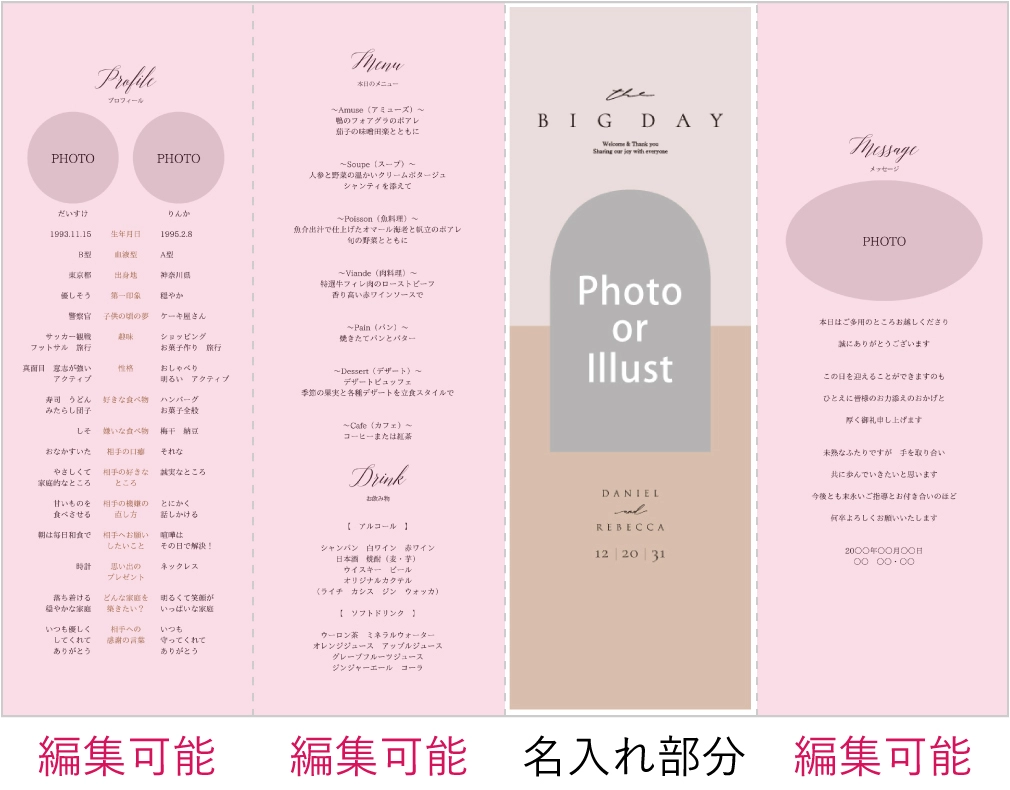 写真が間に合わなかったのですが、かわいいイラストを選択することが出来ました。 私はメニュー表とタイムスケジュールを載せました。 タイムスケジュールはアイコンも表示できるのでパッと見で分かりやすいです☆ 外側の半透明の用紙は折り目が見えるのですが、少し折りづらいので慎重に折り進めるのがオススメです!