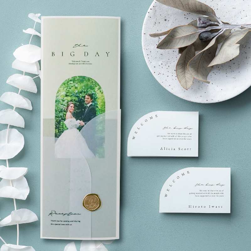 ペーパーアイテムは節約をしたくて、コスパがいいPIARYに決めました。 デザイン豊富で迷った末に上品かつシンプルなデザインのニュアンセスアーチのピスタチオグリーンに決めました。 席次表だけでなく透明のカバーがセットで付いてくるのも魅力的です。 私が購入したタイミングがよく席札も無料で注目ができてかなりお得でした。 今後、結婚式を挙げる友人がいたら是非おすすめしたいです。