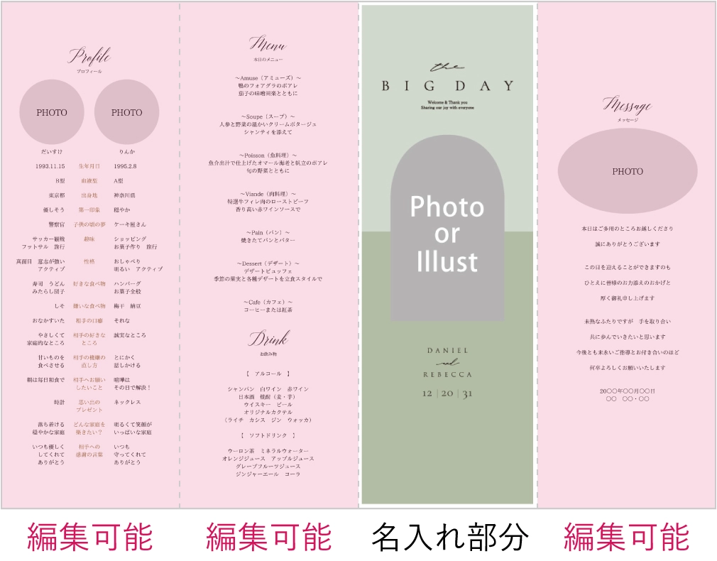 友人へはオリジナルのデータで席次表を作成しましたが、親族、会社関係へは紙にしました。 プロフィール項目も内容編集できたこと、卓ナンバーも画像アップロードできたのでよりオリジナルで作れて大満足でした。