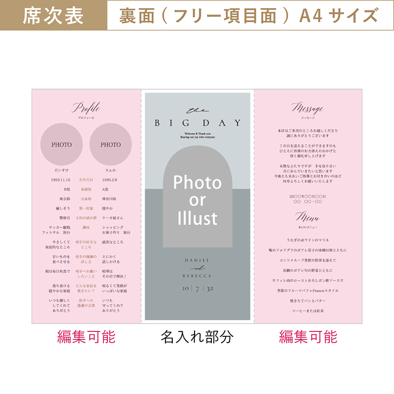 おふたりのプロフィールに加え、メニューやタイムラインなどが印刷できます。