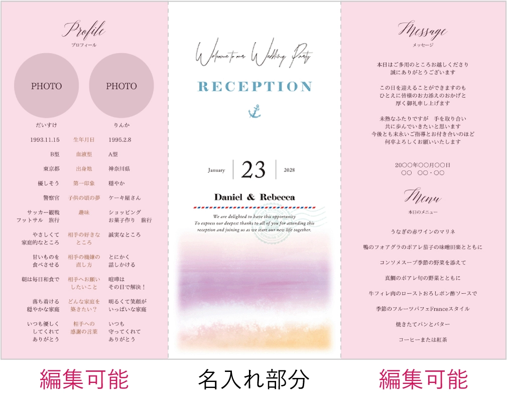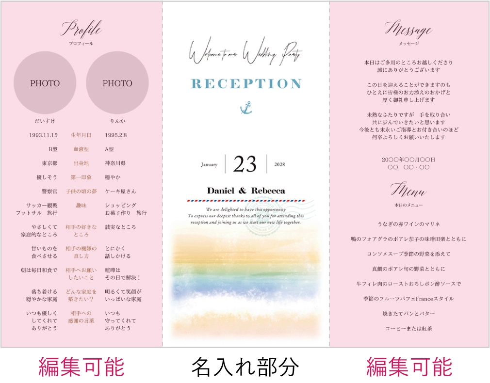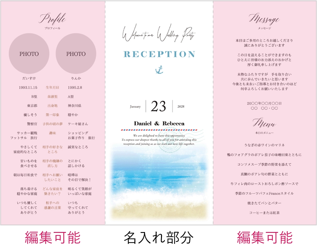 テーマを海にしたのでリゾート風で探しました。 web招待状と同じデザインにしたかったので、こちらを購入しました。 印刷込みで組み立てのみだったので簡単でした。 コスパも良く、こちらを使用して良かったなと思います。