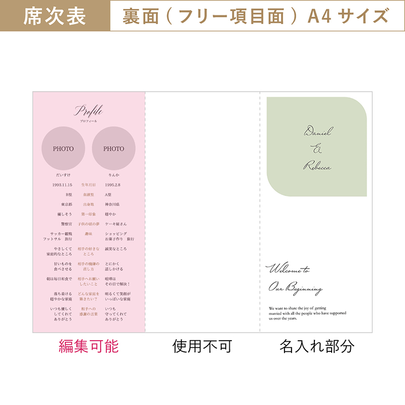 おふたりのプロフィールに加え、メニューやタイムラインなどが印刷できます。